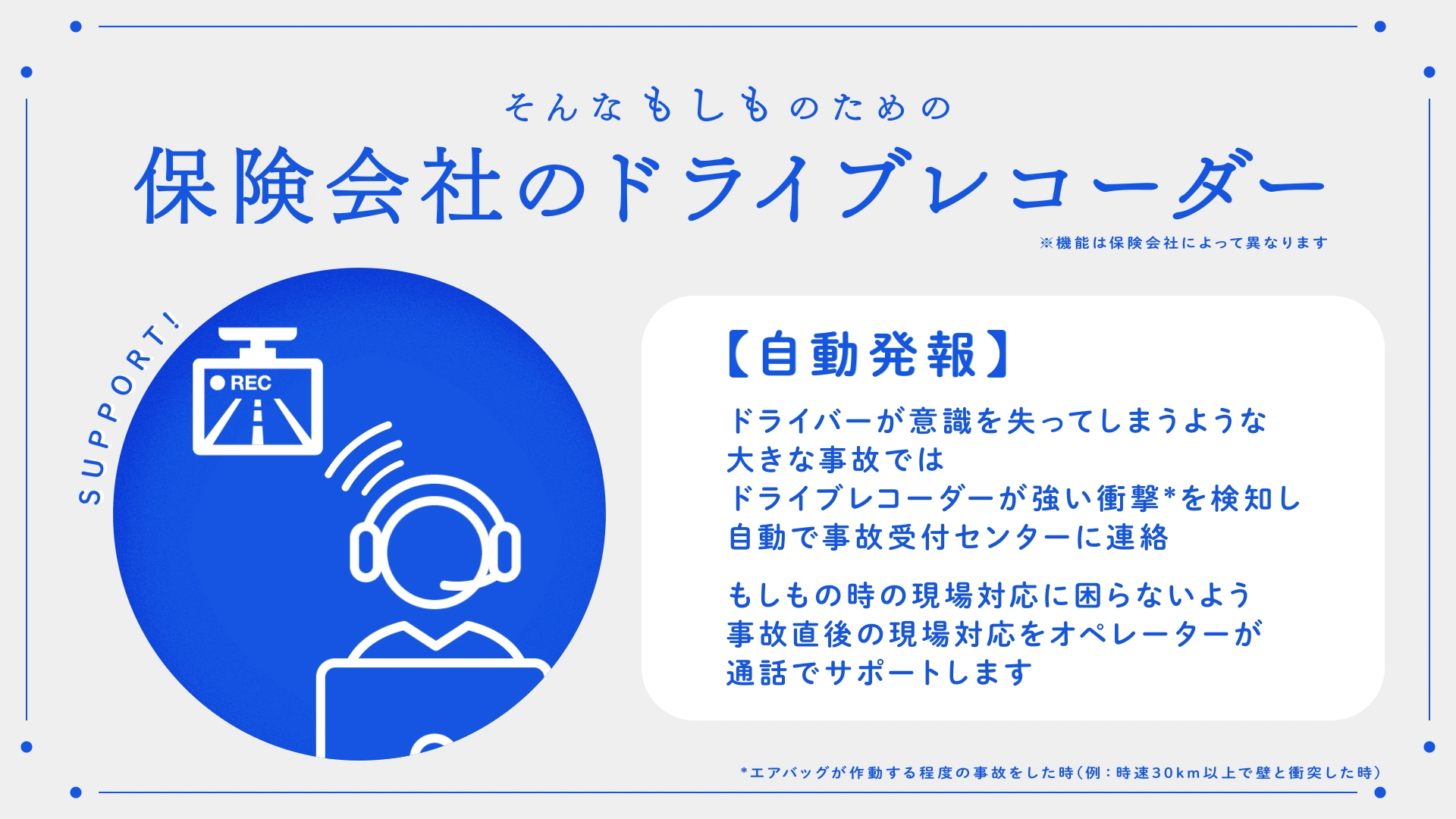 「そもそもどこから連絡すればいいのか?」、「相手と揉めたらどうしよう、、、」そんなわからないことや不安だらけの事故対応をサポートしてくれるのが保険会社のドライブレコーダーです。